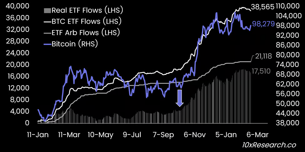 صندوقهای قابل معامله بیت کوین در ایالات متحده از زمان راهاندازی خود در ژانویه ۲۰۲۴ تاکنون حدود ۳۹ میلیارد دلار جریان ورودی جذب کردهاند. با این حال، به گفته مارکوس تیلن (Markus Thielen)، رییس بخش تحقیقاتی شرکت ۱۰ ایکس ریسرچ (10X Research) تنها ۱۷.۵ میلیارد دلار، کمتر از نیمی از این مبلغ، نشاندهنده خرید واقعی بلندمدت است.
