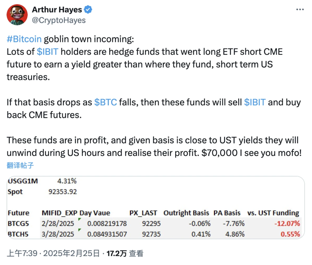 با توجه به وضعیت نامشخص بازار، تحلیلگران برجسته نظرات متفاوتی در مورد آینده آن ارائه دادهاند. آرتور هیز (Arthur Hayes)، بنیانگذار بیتمکس (BitMEX)، که از پایان ژانویه بر هدف ۷۰,۰۰۰ دلاری به دلیل موقعیتهای شورت تأکید دارد، بار دیگر تحلیل خود را ارائه کرده است. او توضیح داده که بسیاری از هولدرهای IBIT، صندوقهای پوشش ریسک (Hedge Funds) هستند که با خرید ETF و فروش قراردادهای آتی بیت کوین در بازار CME، سودی بالاتر از اوراق خزانهداری ایالات متحده به دست میآورند.