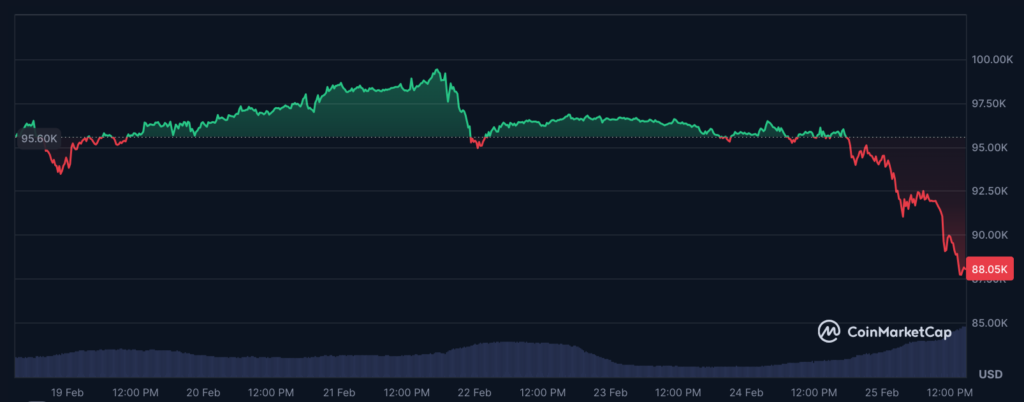 قیمت بیت کوین در طول ۲۴ ساعت گذشته بیش از ۹٪ کاهش یافته و در زمان نگارش مطلب، به ۸۶,۸۸۸ دلار رسیده است.