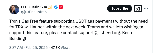 در همین حال بنیاد ترون از جولای سال ۲۰۲۴ اعلام کرد که در حال توسعه ابزارهایی برای فعال کردن قابلیت گس فری در این شبکه است. پیشتر نیز سان اعلام کرده بود که این قابلیت تا پایان سهماهه چهارم سال ۲۰۲۴ عرضه خواهد شد.