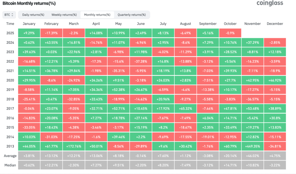 دادههای وبسایت CoinGlass نشان میدهد که اکتبر در میان همه ماههای سال، دومین ماه پربازده برای BTC بوده است. میانگین بازدهی این ماه از سال ۲۰۱۳ تاکنون حدود ۲۰.۱٪ بوده است.