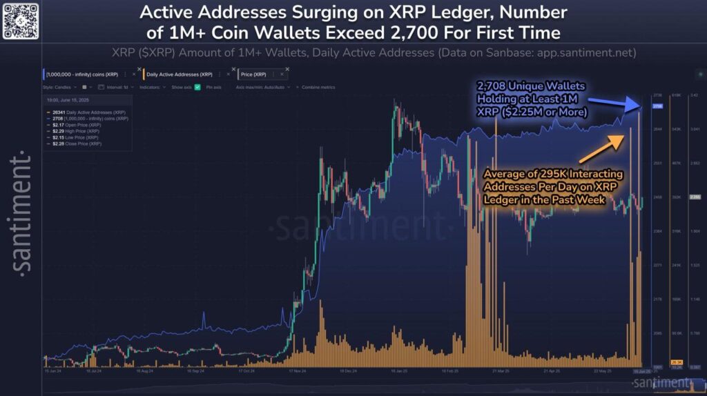 بر اساس دادههای جدیدی که توسط پلتفرم تحلیل دادههای آنچین سنتیمنت (Santiment) منتشر شده، تعداد آدرسهای فعال روزانه شبکه XRP طی هفته گذشته از ۲۹۵,۰۰۰ آدرس فراتر رفته است.