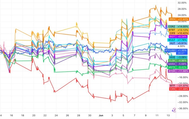 طبق گزارش د ماینر مگ، بین ۴ می تا ۱۳ ژوئن (۱۴ اردیبهشت تا ۲۳ اردیبهشت)، قیمت بیتکوین تنها ۱.۳۵٪ رشد کرده، اما در همین بازه، سهام شرکت IREN حدود ۲۱.۴٪ افزایش یافته است. همچنین سهام شرکتهای بیت دیجیتال (Bit Digital)، کور ساینتیفیک (Core Scientific) و سایفر ماینینگ (Cipher Mining) نیز رشدی دورقمی داشتهاند.