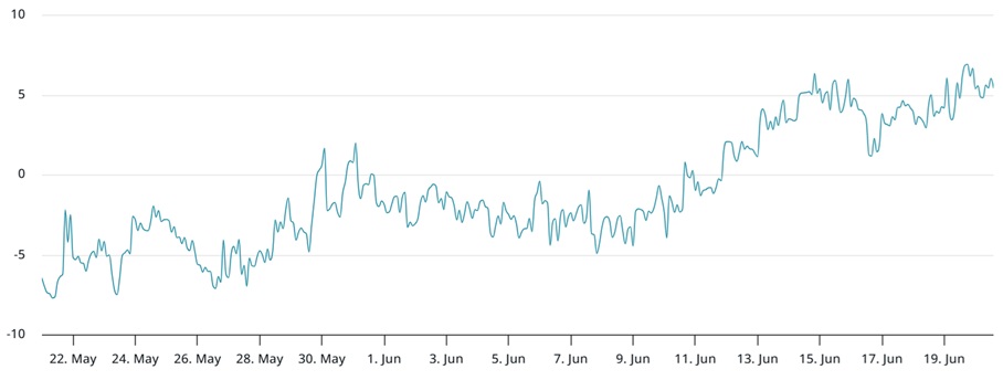 در شرایط خنثی، معاملات آتی ماهانه بیت کوین معمولاً ۵ تا ۱۵٪ بالاتر از بازارهای اسپات معامله میشوند تا دوره تسویه طولانیتر خود را جبران کنند. این شاخص از ۱۲ ژوئن، پس از ریجکت قیمت در سطح ۱۱۰,۰۰۰ دلار، زیر آستانه خنثی باقی مانده است.