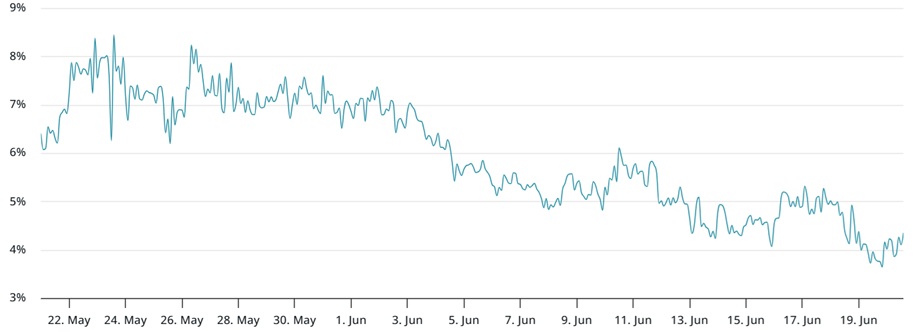 این معیار در مقایسه با دو هفته قبل بدتر شده است، حتی با اینکه بیت کوین در ۵ ژوئن با قیمت ۱۰۰٬۴۵۰ دلار معامله شد. پریمیوم قراردادهای آتی روز پنجشنبه به زیر ۴٪ کاهش یافت و پایینترین سطح در سه ماه گذشته را نشان داد. جالبتر اینکه، معیار قراردادهای آتی بیت کوین اکنون کمتر از سطوح ثبت شده در اوایل آوریل است؛ زمانی که بیت کوین در ۲۴ ساعت ۱۰٪ کاهش یافت و به ۷۴٬۴۴۰ دلار رسید.
