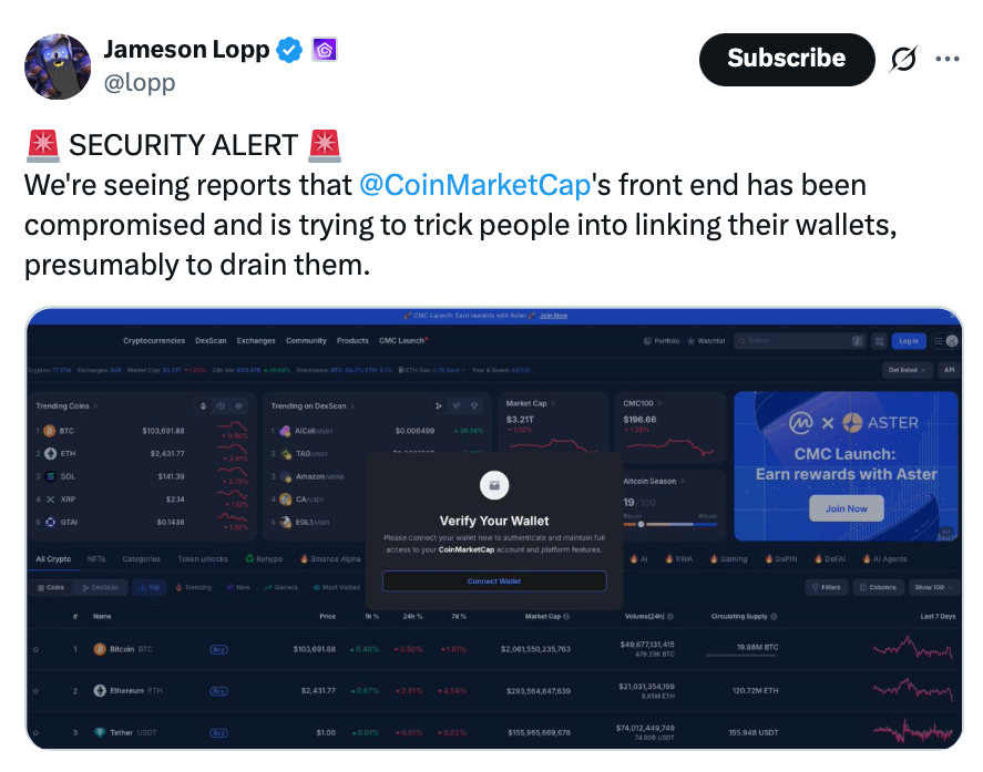 کوینمارکتکپ به کاربران هشدار داد که از اتصال کیف پول خود به این اعلان خودداری کنند و تأکید کرد که تیم آنها در حال کار برای «رفع این مشکل» است.