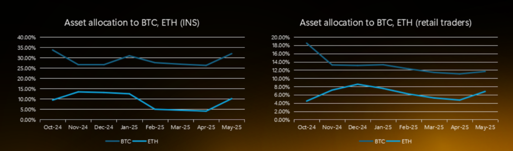 اما با وجود این روند صعودی، سرمایهگذاران خرد از نوامبر ۲۰۲۴ به بعد میزان بیت کوین پورتفوی خودشان را ۳۷٪ کاهش دادهاند و حالا تنها ۱۱.۶٪ از سبد آنها به پادشاه رمزارزها اختصاص دارد. این رقم، تقریباً نصف میزان بیت کوین در اختیار نهادهای مالی است.