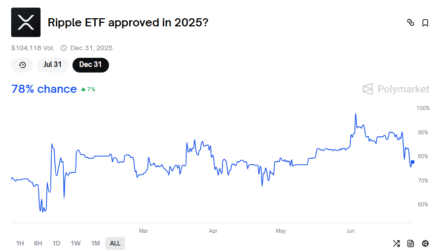 در حال حاضر شانس تایید ETF ریپل در پلتفرم پالیمارکت (Polymarket)، به ۷۸٪ رسیده است. این در حالی است که اوایل این ماه این احتمال به ۹۸.۲٪ رسیده بود. با این حال به نظر میرسد که ادامه پرونده حقوقی ریپل و کمیسیون بورس آمریکا باعث افزایش تردید در بین سرمایهگذاران شده است.