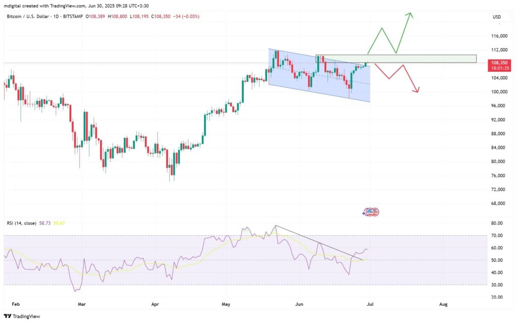 کندل این هفته بیت کوین بهصورت صعودی و با بدنه بزرگ در قیمت ۱۰۸٬۳۵۶ دلار بسته شد. بیت کوین در تایم فریم روزانه در تلاش برای شکستن سقف کانال نزولی است و یک ناحیه مقاومتی در محدوده ۱۰۸ هزار دلار را پیش روی خود دارد. در صورتی که قیمت بالای این سطح تثبیت شود احتمال ثبت یک سقف جدید دور از انتظار نخواهد بود. همچنین، RSI هم در تایم فریم روزانه یک شکست صعودی را نشان میدهد که میتواند ما را به صعود بیشتر امیدوار کند. اما در صورت ریزش، احتمال کاهش قیمت تا محدوده کف کانال وجود خواهد داشت.