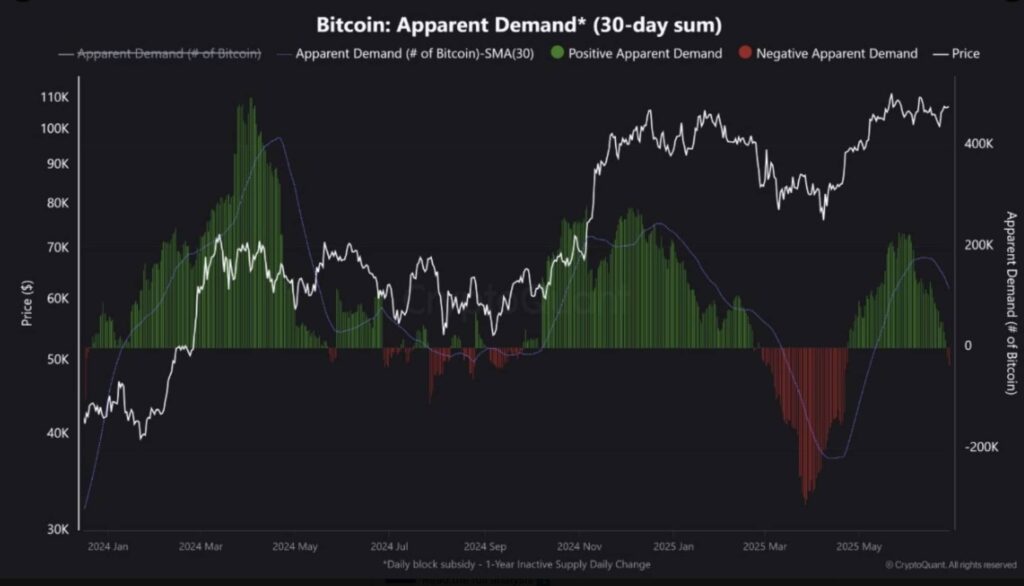 درریزش اخیر، هولدرهای بلندمدت دست به فروش در سود زدند. هر چند، مقداری از این عرضه توسط تقاضای هولدرهای کوتاهمدت جذب شد، اما اکنون تقاضای منفی دیده میشود. میزان منفی فعلی نشاندهنده کسری تقاضای بحرانی است. جریان ورود بیت کوین به بازار از سوی ماینرها و LTHهای سودجو اکنون بیشتر از چیزی است که خریداران جدید خریداری میکنند.