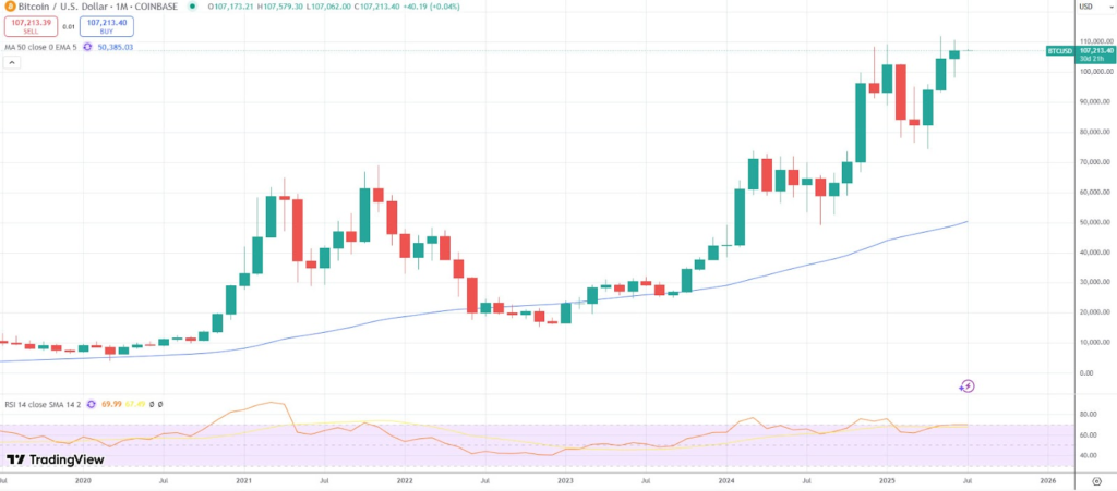 به گزارش ۱۰ ایکس ریسرچ (10X Research)، بیت کوین ممکن است در ماه جولای با رشد ۹٪ مواجه شود، چرا که ماه ژوئن را با بالاترین کندل ماهانه خود در سطحی کمی بالاتر از ۱۰۷٬۰۰۰ دلار به پایان رسانده است.