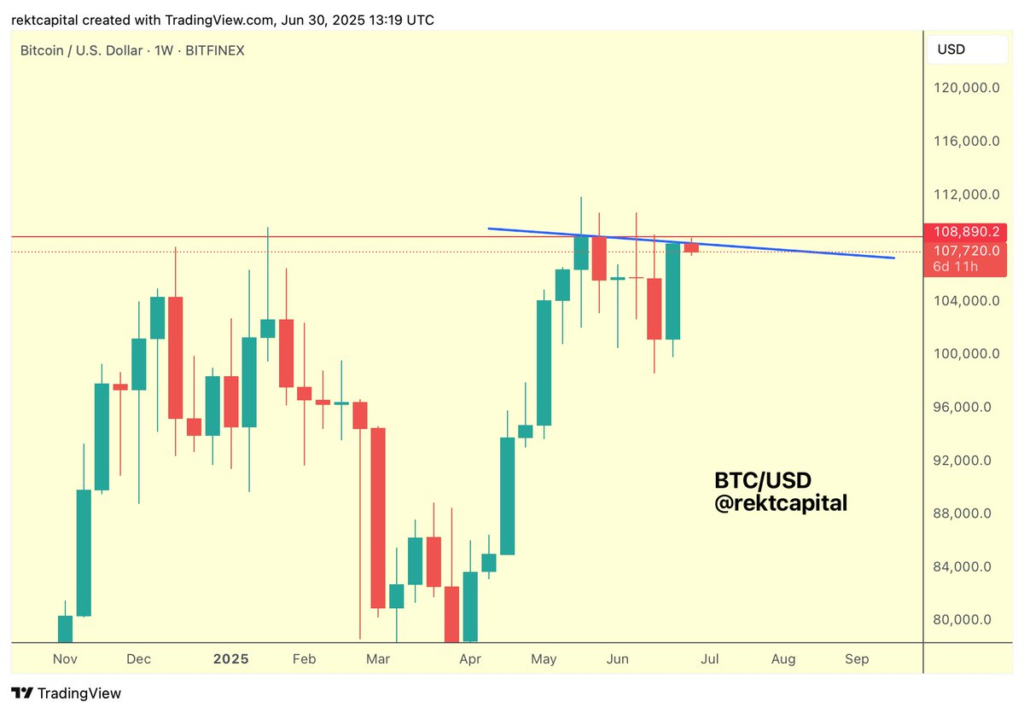 رکت کپیتال (Rekt Capital)، تحلیلگر مطرح بازار، روز دوشنبه به بررسی کندل هفتگی پرداخت و مشاهده کرد که کندل هفته گذشته زیر «آخرین مقاومت هفتگی اصلی» بسته شد که در سطح ۱۰۸٬۸۹۰ دلار قرار داشت. طبق دادههای تریدینگویو، این کندل در صرافی کوینبیس در سطح ۱۰۸٬۳۸۰ دلار بسته شد.