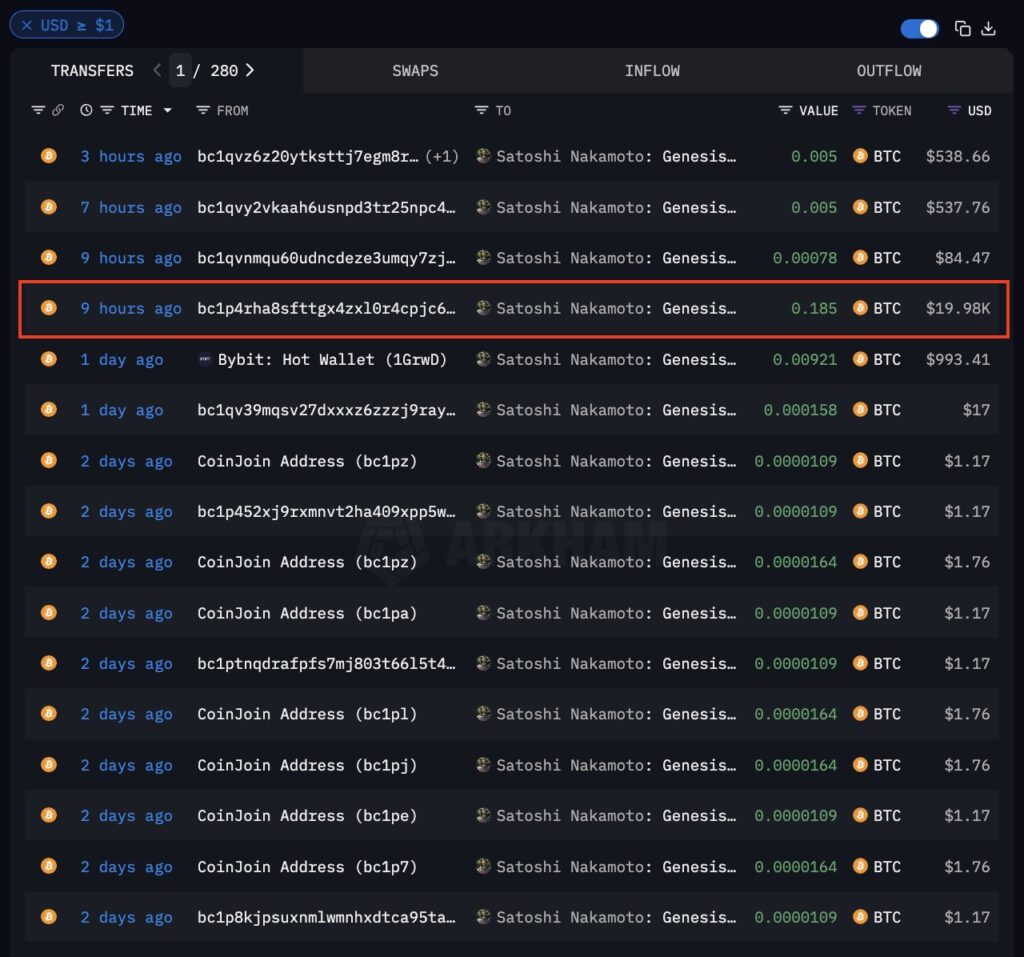 پلتفرم مشهور آرکهام اینتلیجنس روز گذشته در پستی در شبکه اجتماعی ایکس این تراکنش مشکوک را کشف کرد. به گفته تحلیلگران این شرکت، طی این تراکنش مقدار ۰.۱۸۵ بیت کوین معادل تقریباً ۲۰ هزار دلار به کیف پول خالق بیت کوین واریز شده است. نکته جالب اینجاست که این اولین باری نیست که فرد یا افرادی به این کیف پول بیت کوین ارسال میکنند.