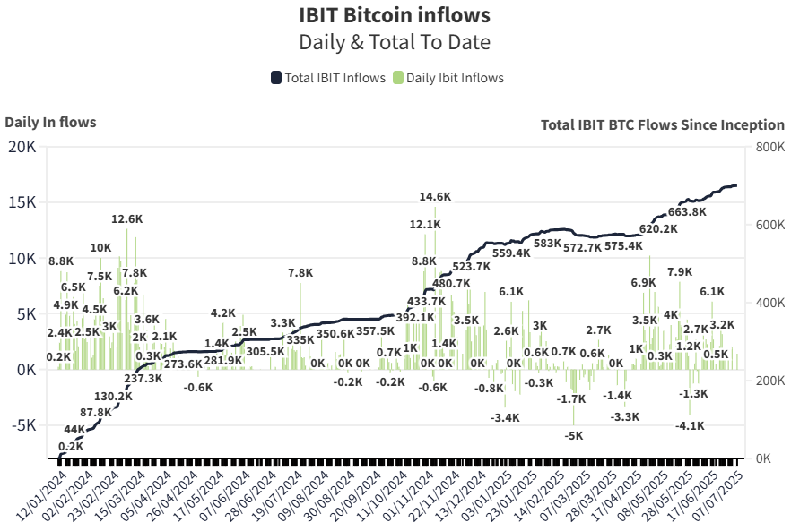توماس فارر (Thomas Fahrer) – همبنیانگذار شرکت آپولو (Apollo) – اعلام کرد که صندوق آیبیت (IBIT) بلکراک در حال حاضر ۷۰۰٬۳۰۷ واحد BTC نگهداری میکند. طبق دادههای سایت رسمی iShares، این صندوق تا روز پنجشنبه ۶۹۸٬۹۱۹ واحد بیت کوین داشته است. بنابراین، طی دو جلسه معاملاتی اخیر، ۱٬۳۸۸ واحد بیت کوین به موجودی آن اضافه شده است.