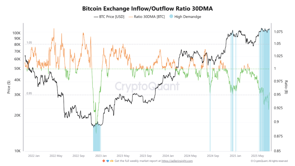 در حالی که افت به ۱۰۰٬۰۰۰ دلار تنها یک اصلاح ۹ درصدی محسوب میشود، دادههای کریپتوکوانت نشان میدهد که فعالیت بازار حاکی از بازگشت اعتماد بلندمدت است. نسبت ماهانه خروجی/ورودی به ۰.۹ کاهش یافته است که از پایان بازار نزولی ۲۰۲۲ تاکنون مشاهده نشده بود و از نظر تاریخی نشانهای از تقاضای قوی است.