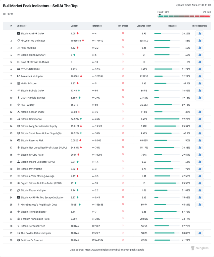 این شاخص قیمت بیت کوین را با میانگین متحرک ساده ۲۰۰ روزه مقایسه میکند و مقدار بهدستآمده میتواند بهعنوان معیاری برای سنجش قدرت بازار در مقایسه با دورههای مشابه در چرخههای قبلی مورد استفاده قرار گیرد. با اینکه این شاخص سیگنال خرید یا فروش قطعی ارائه نمیکند، اما یکی از تعداد زیادی از معیارهای آنچین محسوب میشود که هنوز نشانهای از رسیدن به سقف بازار صعودی نشان ندادهاند. همچنین، فهرست بزرگی از ۳۰ شاخص «سقف بازار صعودی» که توسط کوینگلس (CoinGlass) تهیه شده است، همچنان ۱۰۰٪ در وضعیت «هولد» باقی ماندهاند.