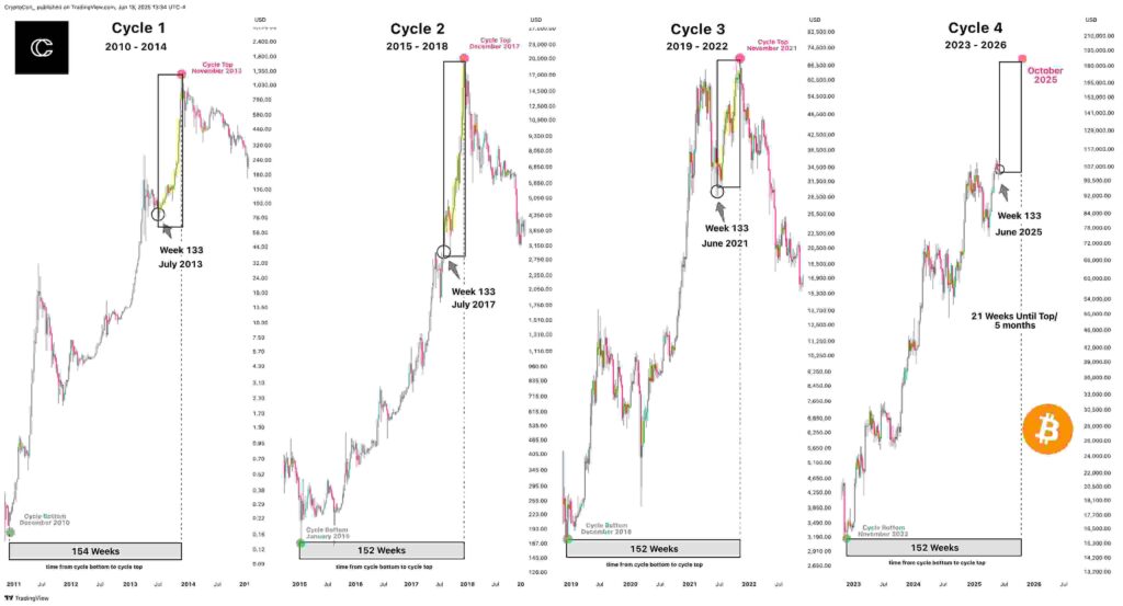 با این حال، برآوردها درباره زمانی که روند صعودی فعلی به «سقف انفجاری» خود برسد متفاوت است. هدفگذاری که بهتدریج محبوبیت بیشتری پیدا میکند، اکتبر ۲۰۲۵ است. این ماه توسط تریدر و تحلیلگر رکت کپیتال (Rekt Capital) نیز بهعنوان سقف احتمالی، بر اساس مقایسههای تاریخی، مطرح شده است.