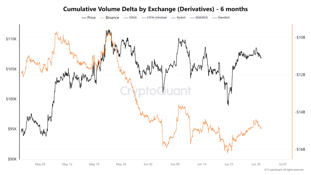 با وجود تداوم فشار فروش در بازار مشتقه بایننس (Binance) طی ۴۵ روز گذشته، بیت کوین جایگاه خود را در محدوده فشرده ۱۰۰٬۰۰۰ تا ۱۱۰٬۰۰۰ دلار حفظ کرده است. دادههای CVD (کومولاتیو ولوم دلتا) همچنان منفی است که نشاندهنده فشار فروش مداوم از سوی فروشندگان است. با این حال، ناتوانی قیمت در شکست به سطوح پایینتر نشان میدهد که این جریان فروش در حال جذبشدن است و این امر بیانگر انباشت میباشد.