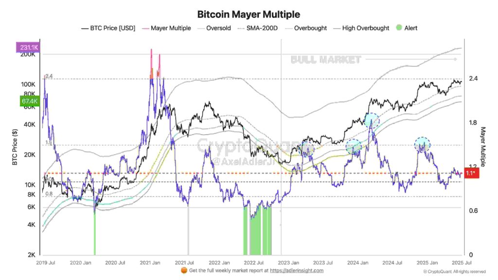 بهگفته تحلیل جدیدی از یکی از شاخصهای کلاسیک قیمت بیت کوین، این ارز دیجیتال با وجود قرار داشتن در نزدیکی سقف تاریخی خود، همچنان «کمارزشگذاری شده» است. در پستی در شبکه اجتماعی X در روز سهشنبه (۹ جولای/۱۸ تیر)، اکسل آدلر جونیور (Axel Adler Jr.)، از مشارکتکنندگان پلتفرم تحلیلهای آنچین کریپتوکوانت (CryptoQuant)، سیگنالهای امیدوارکنندهای را از شاخص میر مالتیپل (Mayer Multiple) بیت کوین فاش کرد.