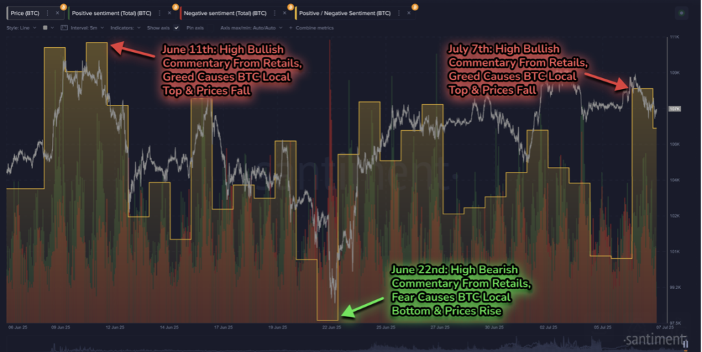 به گزارش میهن بلاکچین، سنتیمنت میگوید میزان خوشبینی معاملهگران نسبت به BTC در شبکههای اجتماعی در حال افزایش است. اما این افزایش خوشبینی همیشه نشانه خوبی نیست. برایان کوینلیوان (Brian Quinlivan) – تحلیلگر این پلتفرم – در گفتگویی گفت واضح است که کاربران بیصبرانه منتظر رسیدن قیمت بیت کوین به بالای ۱۱۰,۰۰۰ دلار هستند.
