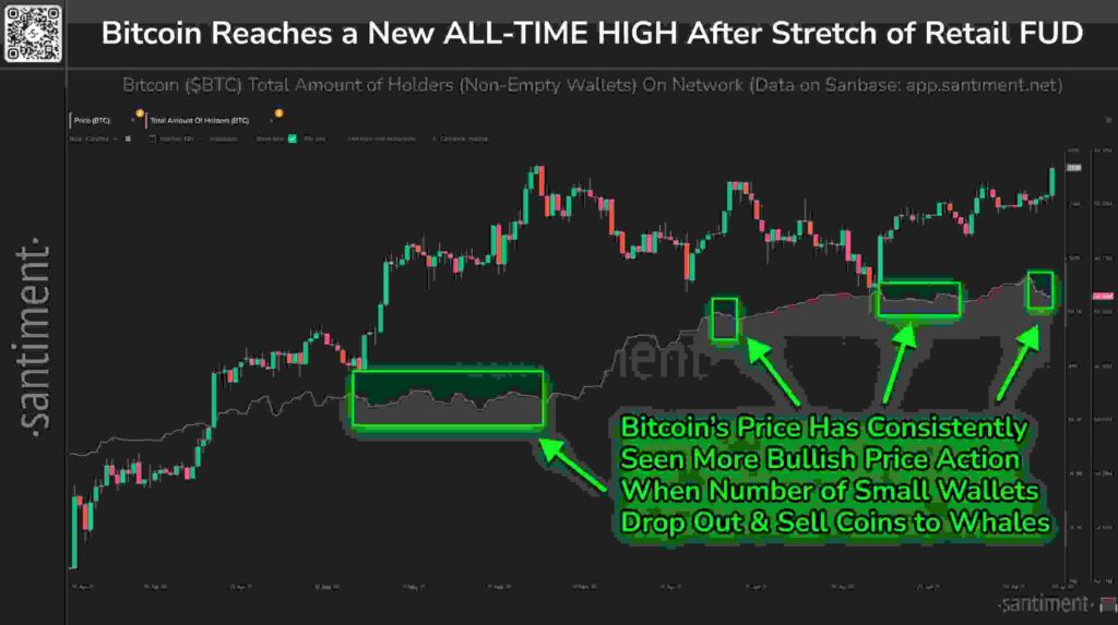 شرکت تحلیل آنچین سنتیمنت (Santiment) بیان کرد که کیفپولهای معاملهگران خرد در این حرکت اخیر تقریباً غایب بودند که از نظر تاریخی شرایط را برای رشدهای شارپ و ناگهانی فراهم میکند.