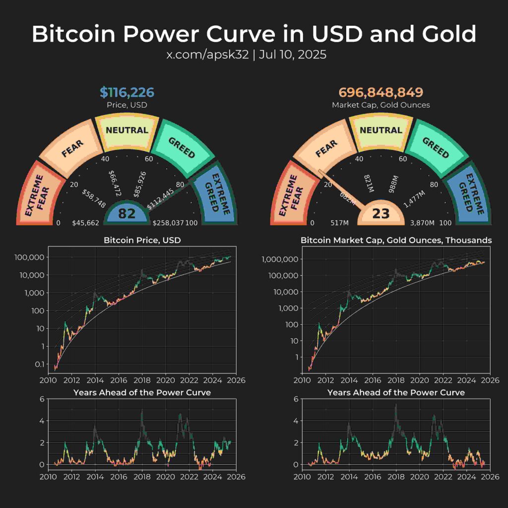 منطقه طمع افراطی بین ۱۱۲٬۰۰۰ تا ۲۵۸٬۰۰۰ دلار است که در اوجهای ۲۰۱۳، ۲۰۱۷ و ۲۰۲۱ دیده شد. اگر این الگو ادامه یابد، بیت کوین میتواند تا کریسمس به ۲۰۰ تا ۳۰۰ هزار دلار برسد و سپس در ابتدای ۲۰۲۶ مومنتوم صعودی خود را از دست بدهد.