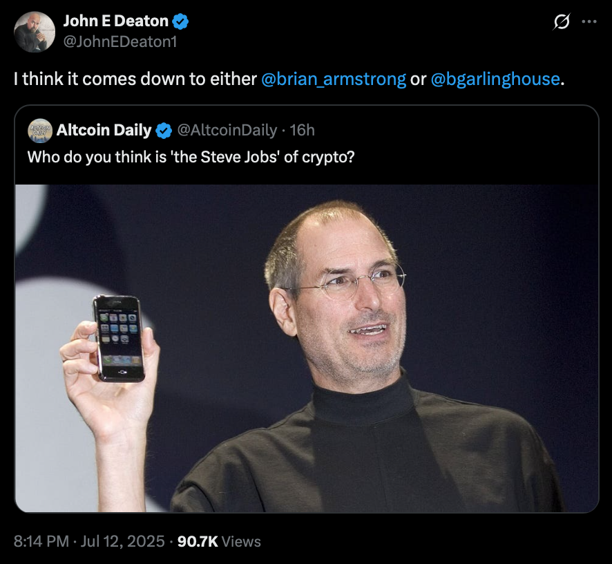 جان دیتن در پستی که در شبکه اجتماعی ایکس (X) منتشر کرد گفت که بهنظر او، لقب استیو جابز کریپتو باید به یکی از این دو نفر داده شود: یا برد گارلینگهاوس، مدیرعامل ریپل یا برایان آرمسترانگ (Brian Armstrong)، مدیرعامل کوینبیس (Coinbase). دیتن این جمله را در پاسخ به سوال یکی از کاربران نوشت که پرسیده بود چه کسی در صنعت کریپتو میتواند معادل استیو جابز باشد.