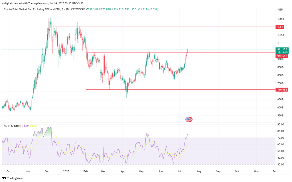 از طرف دیگر در نمودار TOTAL 3 قیمت هنوز در محدوده مشخص شده در حال رنج زدن است در صورت کلوز فول بادی بالای منطقه ۹۴۰ میتوان به رشد قوی آلت کوینها امیدوار بود. اما برای این منظور ابتدا باید منتظر سقف جدید اتریوم باشیم.