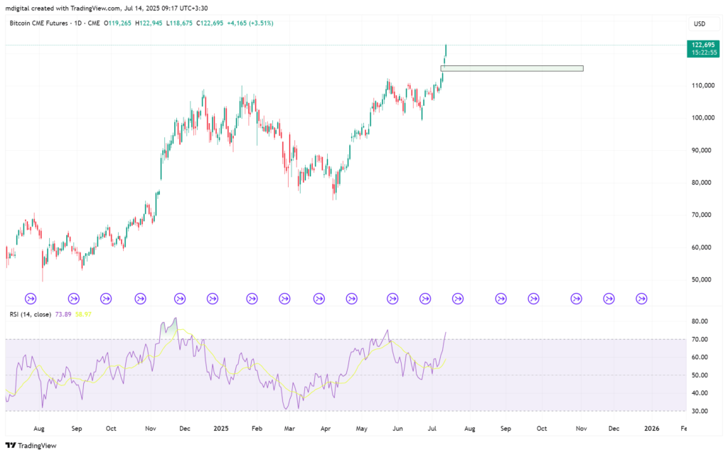 بین ناحیه ۱۱۴ تا ۱۱۵ هزار دلار گپ CME وجود دارد که هنوز پر نشده و نزدیکترین منطقه برای اصلاح است.