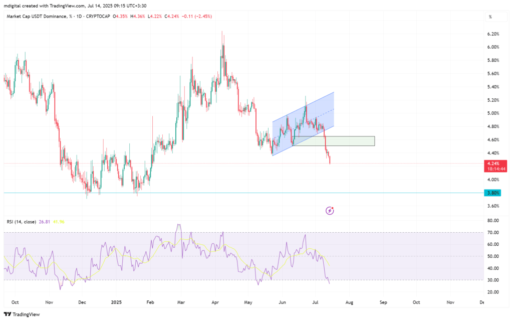 اکنون دامیننس تتر در ناحیه حمایتی مهم دیگری (۴.۲۳٪) قرار دارد که در صورت شکست آن میتوانیم منتظر صعود بیشتر در بازار کریپتو باشیم.