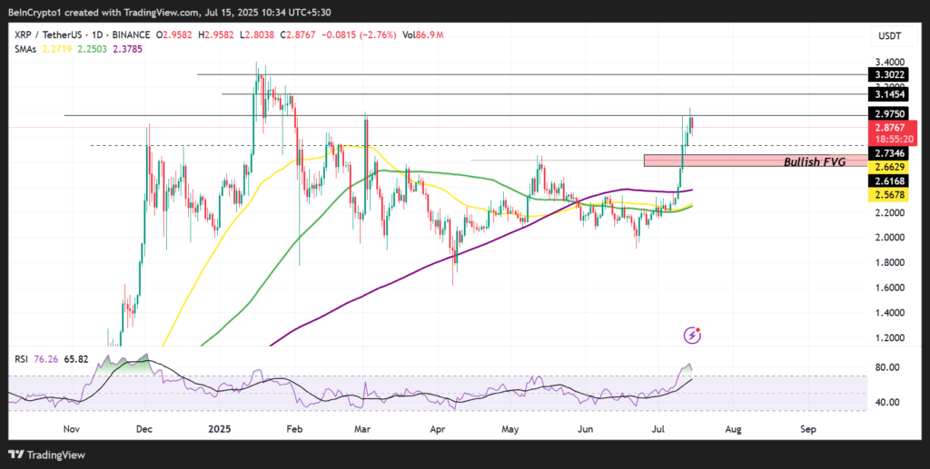 اگر فشار خرید افزایش یابد، قیمت ریپل میتواند از ناحیه عرضه در ۲.۹۷۵۰ دلار عبور کند. در این صورت، مقاومت بعدی در سطح ۳.۱۴۵۴ دلار قرار میگیرد؛ مقاومتی که در اواخر ژانویه ۲۰۲۵ شکل گرفته بود.