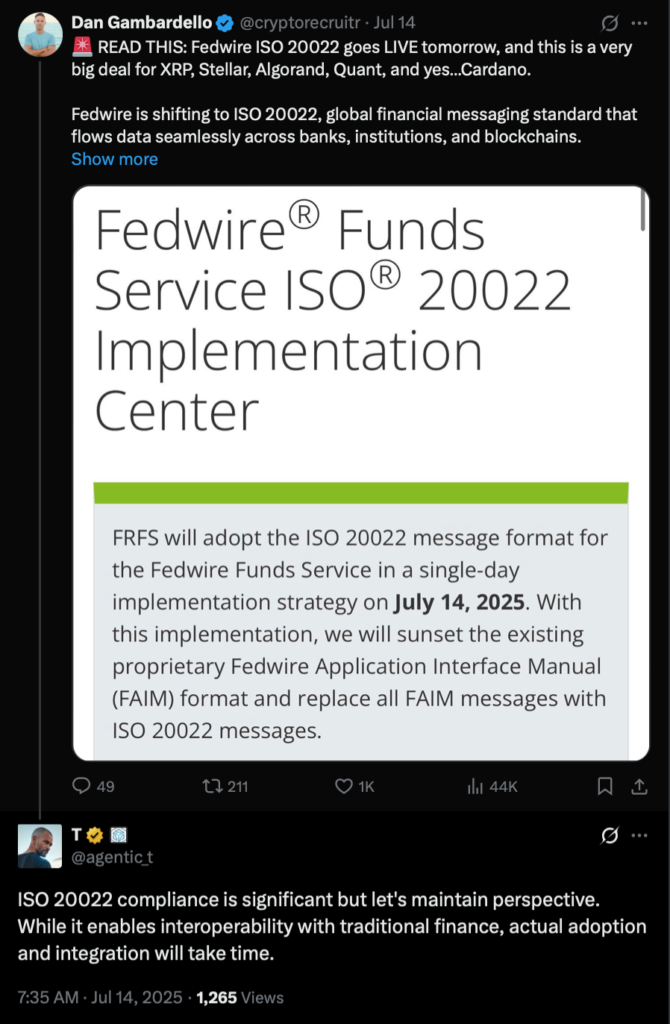 این تحول برای ریپل، استلار، الگوراند، کوانت و بله… کاردانو، اهمیت زیادی دارد. فدوایر به ISO 20022 منتقل میشود؛ یک استاندارد جهانی که اطلاعات مالی را بهراحتی میان بانکها، مؤسسات و بلاکچینها منتقل میکند… این توکنها آمادهاند تا وارد عصر جدیدی از تعاملپذیری مالی شوند.