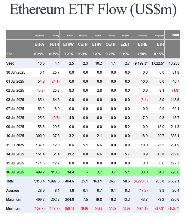 همزمان با این خرید و فروشهای گسترده، ETFهای اسپات اتریوم در بازار آمریکا روز چهارشنبه رکوردشکنی کردند و شاهد ورود بیسابقه ۷۲۶.۶ میلیون دلار سرمایه جدید بودند. این رکورد جدید نسبت به اوج ۴۲۸ میلیون دلاری قبلی که در تاریخ ۵ دسامبر ۲۰۲۴ ثبت شده بود تقریبا ۷۰٪ بالاتر است.