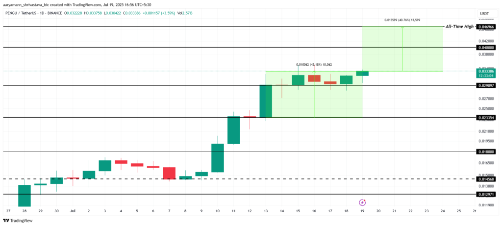 با توجه به روند صعودی و پایدار PENGU در روزهای اخیر، به نظر میرسد هدف بعدی قیمت مقاومت ۰.۰۴۰ دلار باشد. در صورتی که این سطح به عنوان حمایت تثبیت شود، مسیر برای دستیابی به سقف تاریخی و ادامه حرکت صعودی هموارتر خواهد شد.