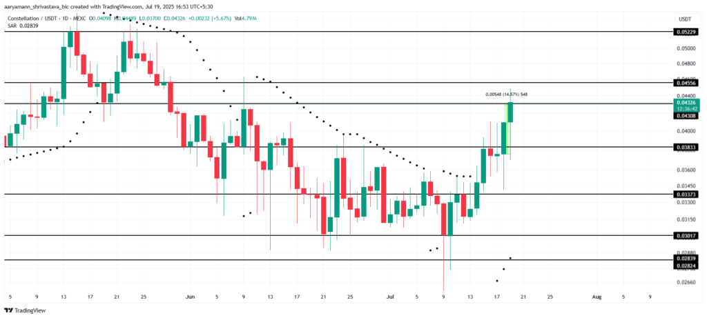 شاخص پارابولیک سار (Parabolic SAR) که در نمودارها زیر شمعهای قیمتی قرار گرفته، حاکی از ادامه روند صعودی کانستلیشن است. در صورتی که این روند حفظ شود، انتظار میرود مقاومت ۰.۰۴۵ دلار شکسته شود و مسیر برای رسیدن به سطح ۰.۰۵۲ دلار هموار گردد.