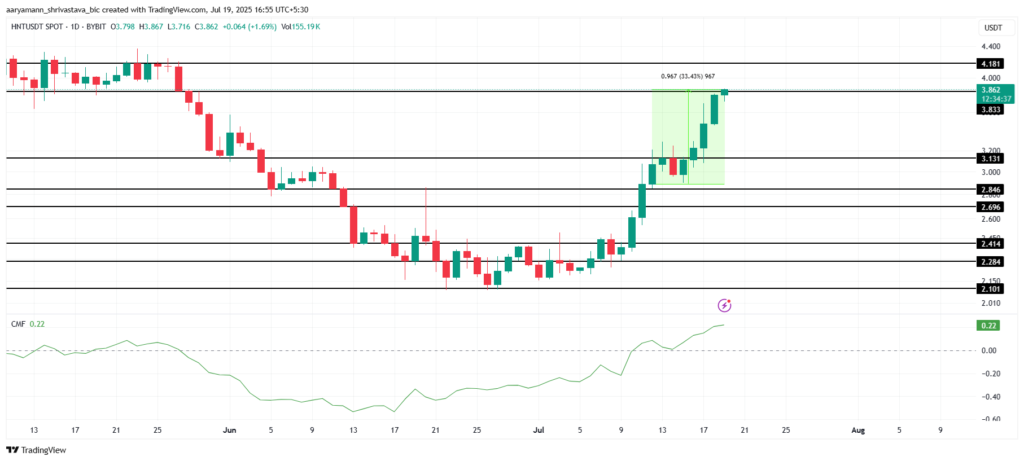بر اساس دادههای شاخص جریان پول چایکن (CMF)، ورود سرمایه به HNT در حال حاضر حتی بیشتر از ماه می است. این موضوع نشاندهنده افزایش اعتماد سرمایهگذاران نسبت به این پروژه است و میتواند به عبور از مقاومت فعلی کمک کند.