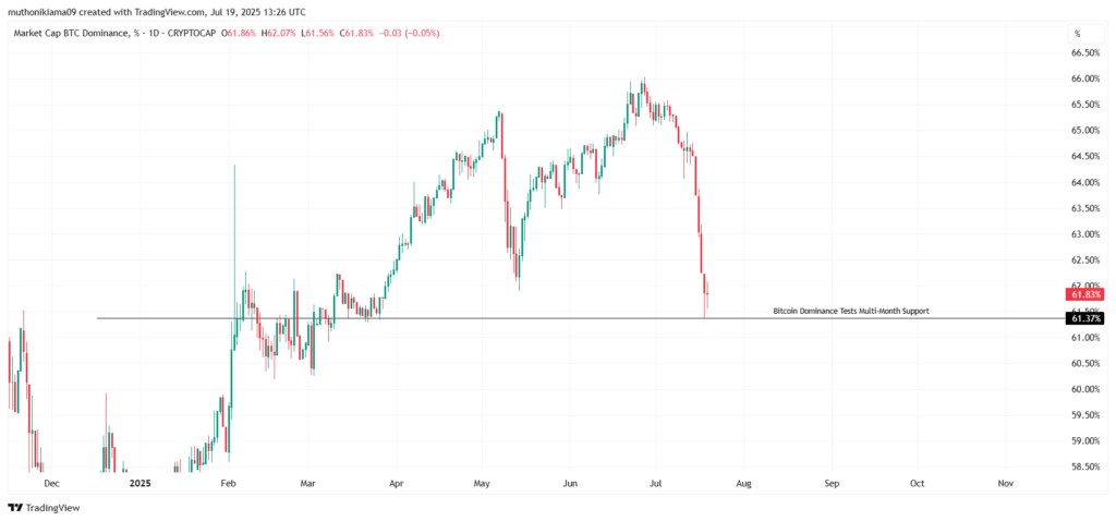 در روزهای اخیر، سهم بیت کوین از بازار رمزارزها با ارزش ۴ تریلیون دلار کاهش یافته و اکنون به حدود ۶۱٪ (پایینترین سطح از ماه مارچ تاکنون) رسیده است. در حالی که قیمت بیت کوین رشد محدودی را تجربه کرده، آلت کوینها توانستهاند خلأ ایجادشده را پر کنند. بهطور مشخص، در بازهای که اتریوم ۲۱٪ رشد داشته، BTC تنها ۰.۶٪ افزایش یافته است.