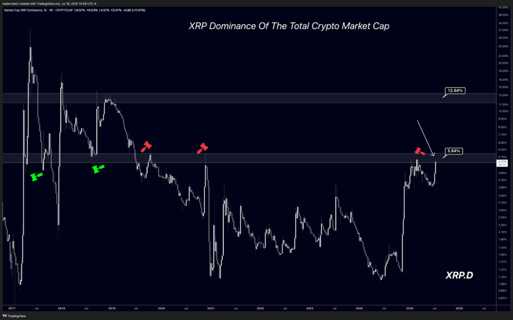 هرگونه کلوز قیمت بالای سطح ۵.۷۵٪ میتواند جرقه آغاز مرحله انفجاری دامیننس XRP باشد.