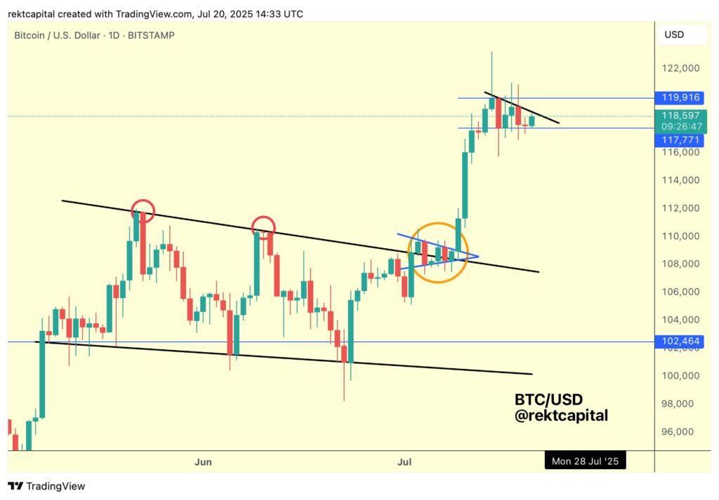 در تایمفریمهای روزانه، رکت کپیتال (Rekt Capital)، معاملهگر و تحلیلگر محبوب، ساختار مشابهی را مشاهده کرد. او دربارۀ نمودار خود اظهار داشت:
