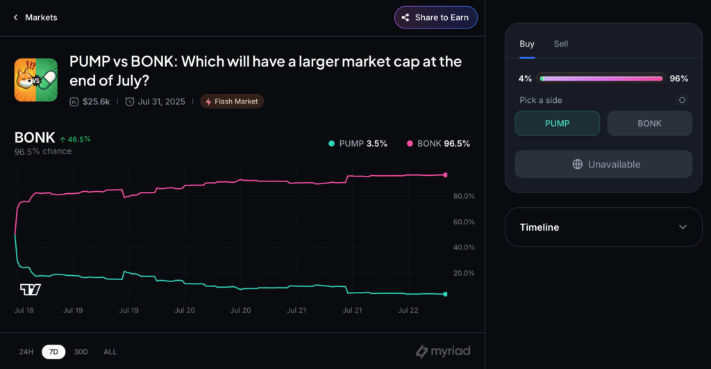در پلتفرم پیشبینی میریاد (Myriad) که توسط شرکت مادر دیکریپت (Decrypt) یعنی دستان (Dastan) توسعه یافته، نظرات کاربران در خصوص رقابت بین توکنهای BONK و PUMP منعکس شده است. اکثر کاربران باور دارند که تا پایان ماه جولای، ارزش بازار BONK از PUMP بیشتر خواهد بود. گرچه در ابتدای عرضه توکن PUMP و در اوج هیجانها، ممکن بود سناریوی برعکس محتمل به نظر برسد، اما اکنون فاصله بین این دو توکن بیش از یک میلیارد دلار شده و BONK با اختلاف قابل توجهی پیشتاز است.