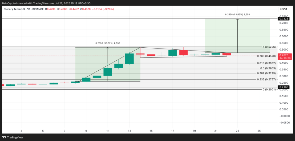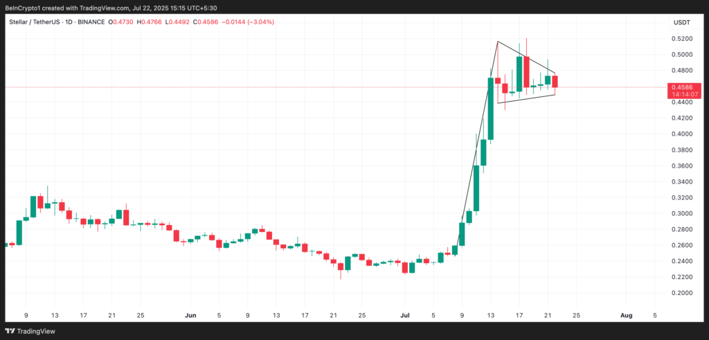 بررسی نمودار روزانه XLM نشان میدهد که این رمزارز در حال تشکیل الگویی به نام پرچم صعودی (Bullish Pennant) است. این الگو زمانی ظاهر میشود که یک حرکت صعودی پرقدرت با دورهای از تثبیت قیمت ادامه پیدا میکند که معمولاً به شکل یک مثلث متقارن کوچک (پرچم) دیده میشود.