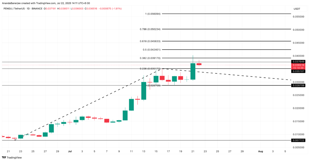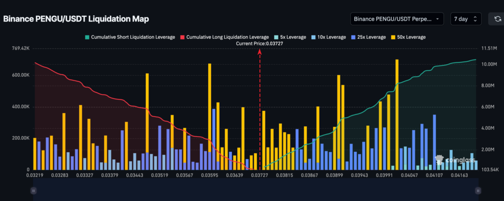 از منظر تحلیل تکنیکال، قیمت PENGU تاکنون دو بار سطح ۰.۰۳۹ دلار که با نسبت فیبوناچی ۰.۳۸۲ همراستاست را آزمایش کرده، اما موفق به شکست قاطع آن نشده است. در حال حاضر، قیمت در نزدیکی همین سطح مقاومت در نوسان است. باید توجه داشت که علاوه بر مقاومت فیبوناچی، سطح ۰.۰۳۷ دلار نیز بهعنوان مقاومت مهم دیگری شناخته میشود.