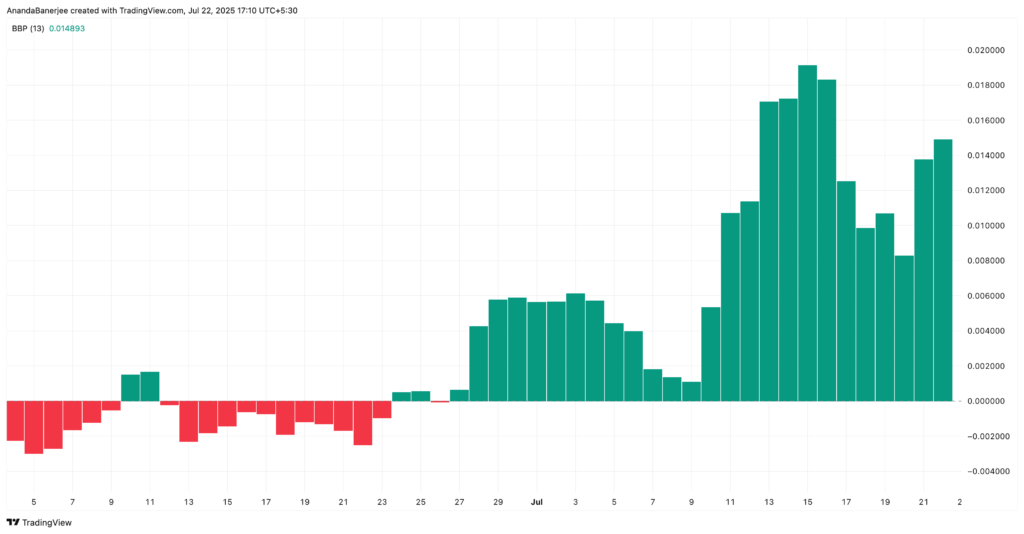 به بیان ساده، زمانی که BBP در محدوده مثبت قرار دارد، قدرت خریداران بیشتر از فروشندگان است. شاخص BBP از اواخر ژوئن تاکنون، حتی در زمانی که قیمت نتوانست از مقاومتهای کلیدی عبور کند، در محدوده مثبت باقی مانده است. این موضوع میتواند نشانهای از حفظ روند صعودی و تثبیت پیش از جهش بعدی باشد.