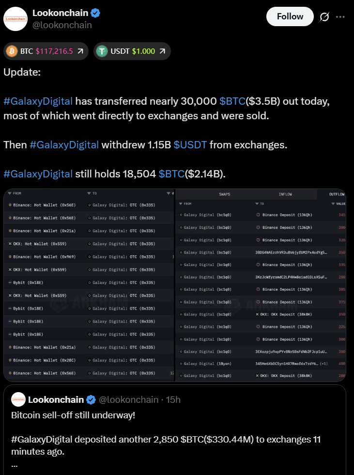 طبق دادههای Lookonchain، چندین تراکنش بزرگ از سوی گلکسی دیجیتال در طول این روز انجام شد که در مجموع تقریباً به ۳۰٬۰۰۰ بیت کوین میرسید و اکثر این وجوه مستقیماً به صرافیها ارسال شده بود.