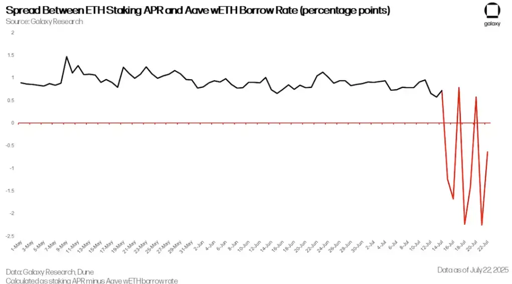 با این حال، به دنبال کمبود عرضه اتریوم که از ۱۶ جولای (۲۵ مرداد) آغاز شد، اختلاف بین بازدهی استیکینگ و هزینۀ استقراض اتریوم منفی شد. تا ۲۱ جولای (۳۰ تیر)، این اختلاف به ۲.۲۵-٪ کاهش یافت و استراتژی را زیانده کرد. این امر باعث لیکوئیدیشن دستهجمعی پوزیشنها توسط معاملهگران شد و کاربران شروع به برداشت اتریوم قفلشده خود، بازپرداخت وامها و کاهش تدریجی اهرم پوزیشن کردند. از آنجا که بسیاری از معاملهگران از LST یا LRT به عنوان وثیقه استفاده میکردند، نیاز داشتند که این داراییها را دوباره به اتریوم تبدیل کرده یا آنها را آناستیک کنند. این امر فشار بیشتری بر بازار ثانویه LST/LRT و صف خروج ولیدیتورهای اتریوم وارد کرد.