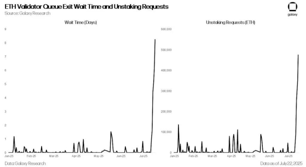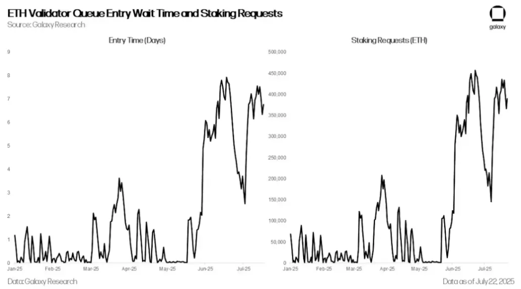 جهش در درخواستها برای برداشت وثیقه، با جهش در تقاضا برای وثیقهگذاری جدید خنثی شد. از ماه ژوئن، درخواستهای وثیقهگذاری اتریوم و طول صف برای تبدیل شدن به ولیدیتور به بالاترین سطح خود از آوریل ۲۰۲۴ رسیده است. این به دلیل عملکرد بهتر اخیر اتریوم در برابر بیت کوین و تأسیس چندین شرکت مالی دارایی دیجیتال (DATCOs) است که در ماههای اخیر بیش از ۲.۵ میلیارد دلار اتریوم خریداری کرده و شور و شوق را برای اتریوم برانگیختهاند.