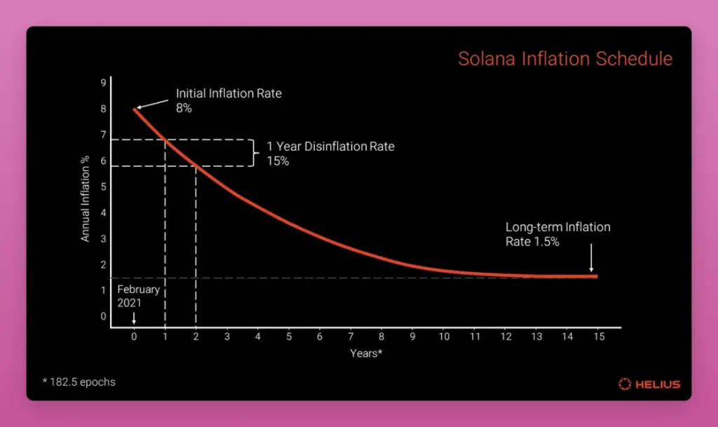 سولانا مانند اتریوم سقف عرضه مشخصی ندارد. نرخ تورم فعلی ۴.۳۹۵٪ و نرخ کاهش سالانه ۱۵٪ عنوان شده که در نهایت باید حول ۱.۵٪ تثبیت شود.