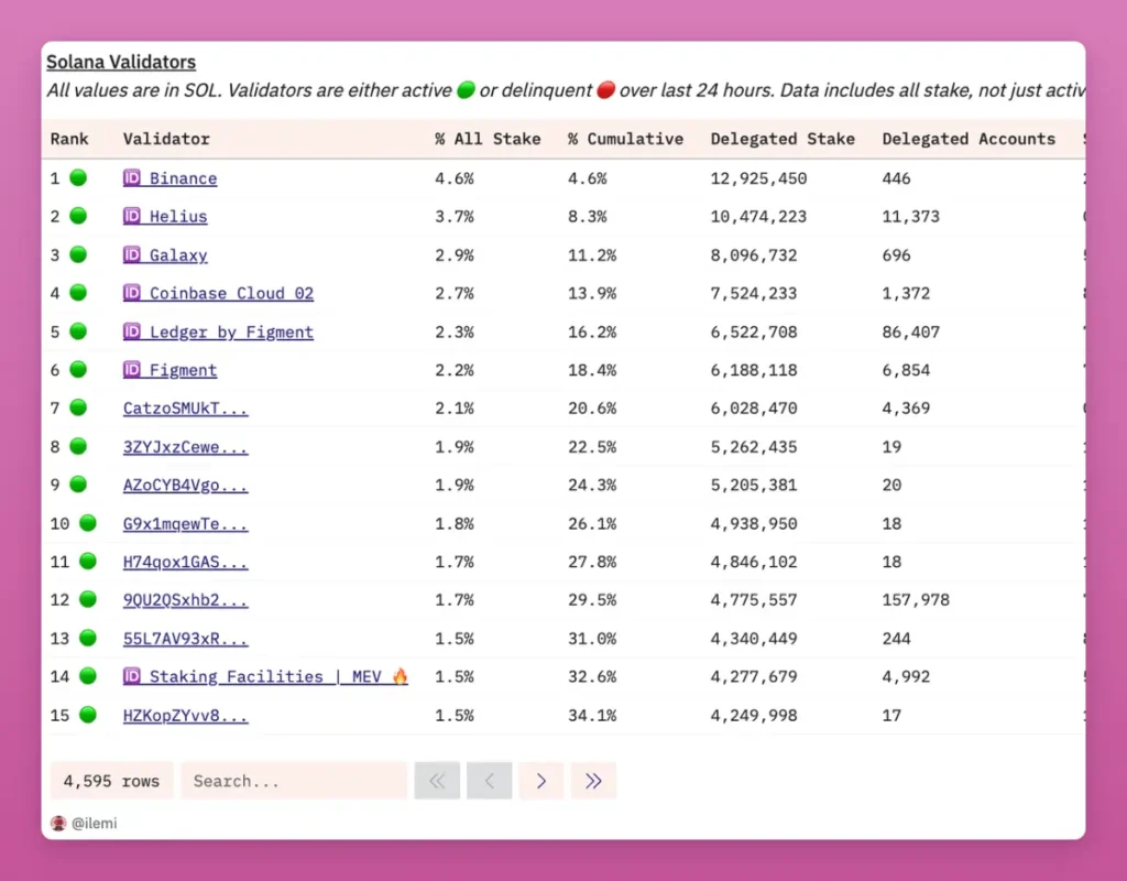 در نمودارهای منتشرشده مشاهده میشود که هلیوس (Helius) حدود ۳.۷٪ از عرضه استیک فعال را در اختیار دارد. همچنین گلکسی (Galaxy) دارای ۸ میلیون SOL استیکشده واگذارشده (Delegated) است.