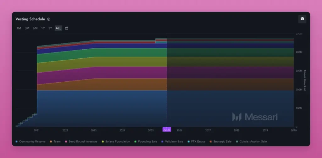 طبق آمار مزاری (Messari)، حدود ۹۹.۸۸٪ از SOL از حالت قفل خارج شده است و فقط ۶۰۰,۰۰۰ توکن سولانا همچنان قفل است که در اختیار افتیاکس (FTX) قرار دارد یا از طریق معاملات OTC واگذار شده است.