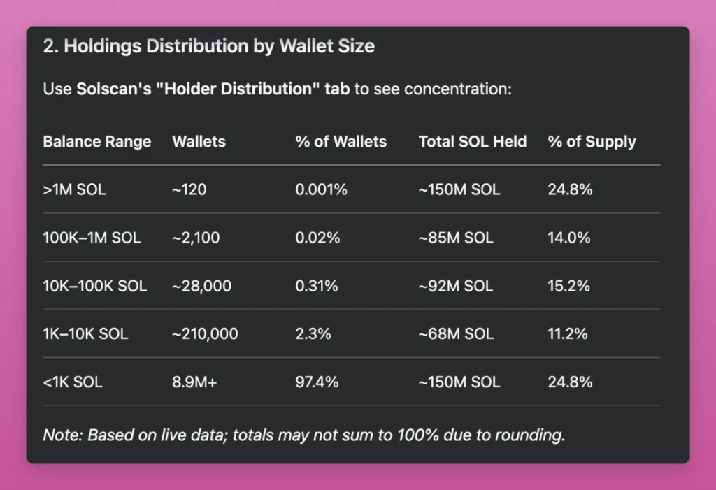 حدود ۹۷.۴٪ از کیف پولها کمتر از ۱,۰۰۰ سولانا دارند که در مجموع ۲۴.۸٪ از عرضه را در اختیار دارند. البته باید توجه داشت که اعداد این بخش بر اساس برآوردهای تقریبی است و ممکن است دقیق نباشد.